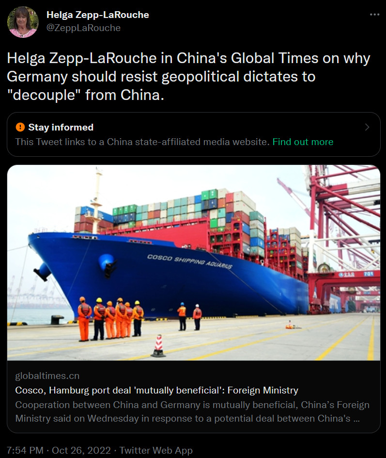 Das Bundeskabinett ermöglichte (2022-10-26) eine Beteiligung des von der Kommunistischen Partei Chinas kontrollierten Unternehmens COSCO von maximal 24,99% an der HHLA (Hamburger Hafen und Logistik AG). Ursprünglich war von beiden Unternehmen eine Beteiligung von 35% beabsichtigt. Anschließend reiste Bundeskanzler Olaf Scholz zu seinem Antrittsbesuch nach Peking.